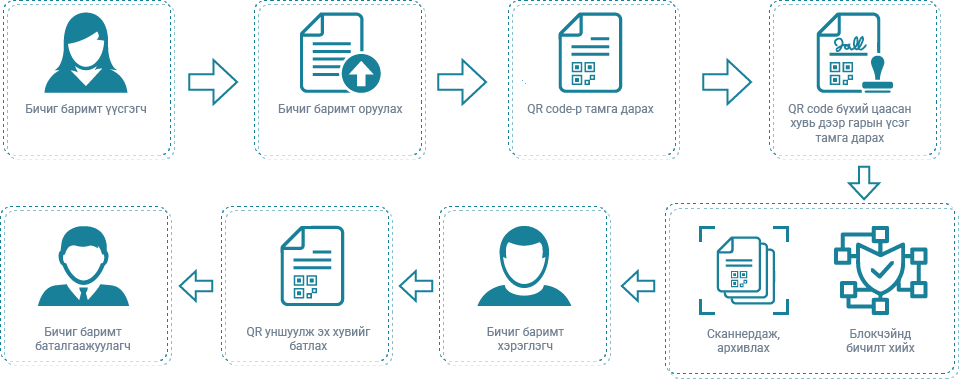Байгууллагын албан тоот, мэдээлэл/лавлагаа зэрэг бичиг баримтанд дахин давтагдашгүй QR кодыг олгож, тухайн кодыг уншуулснаар баримтын эх хувийг онлайнаар харж харьцуулах хялбар боломжийг олгоно.